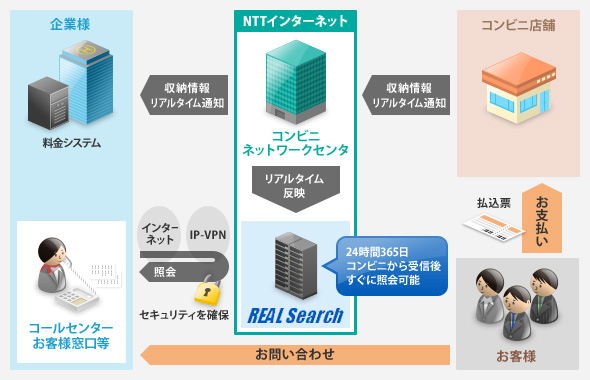コンビニネットワークサービスをご利用頂いている企業様が「REAL Search」オプションを追加することで、企業様のコールセンターやお客様窓口において最新のお支払い状況を確認することが可能になる他、夜間、休日など企業様システムが停止している場合でも、24時間365日いつでもコンビニエンスストアからの収納情報を照会することが可能になります。